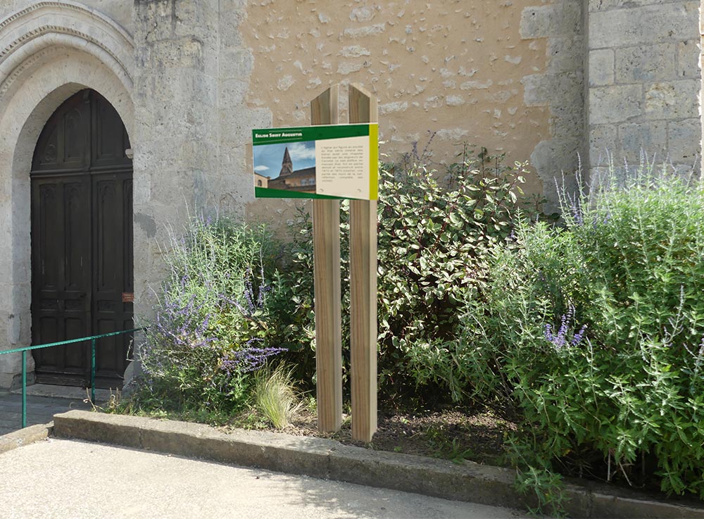 Panneau d'informations sur structure en bois de pin avec panneau en vinyle contrecollé sur dibond, pour l'aménagement d'un circuit patrimoine. Le panneau met en valeur le patrimoine bâti et culturel de la ville en présentant l'église devant laquelle il se trouve. Une photo et un texte permettent aux visiteurs d'en apprendre davantage sur le site.