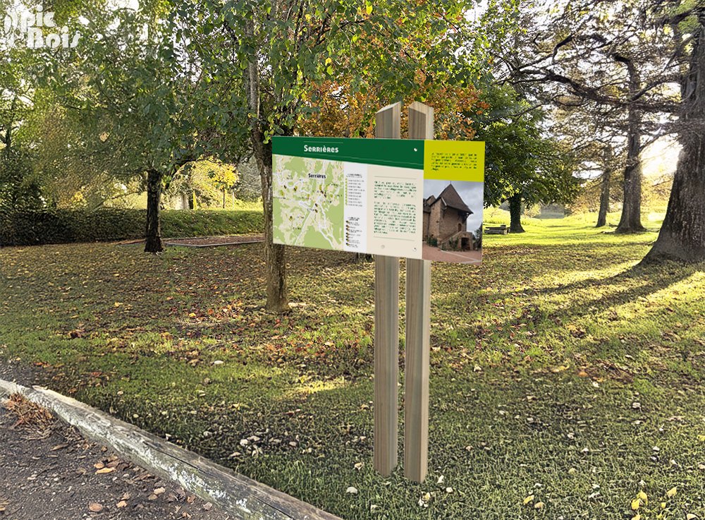 Panneau d'informations sur structure double en bois de pin, avec panneau en vinyle imprimé et contrecollé sur dibond pour l'aménagement d'un circuit patrimoine.