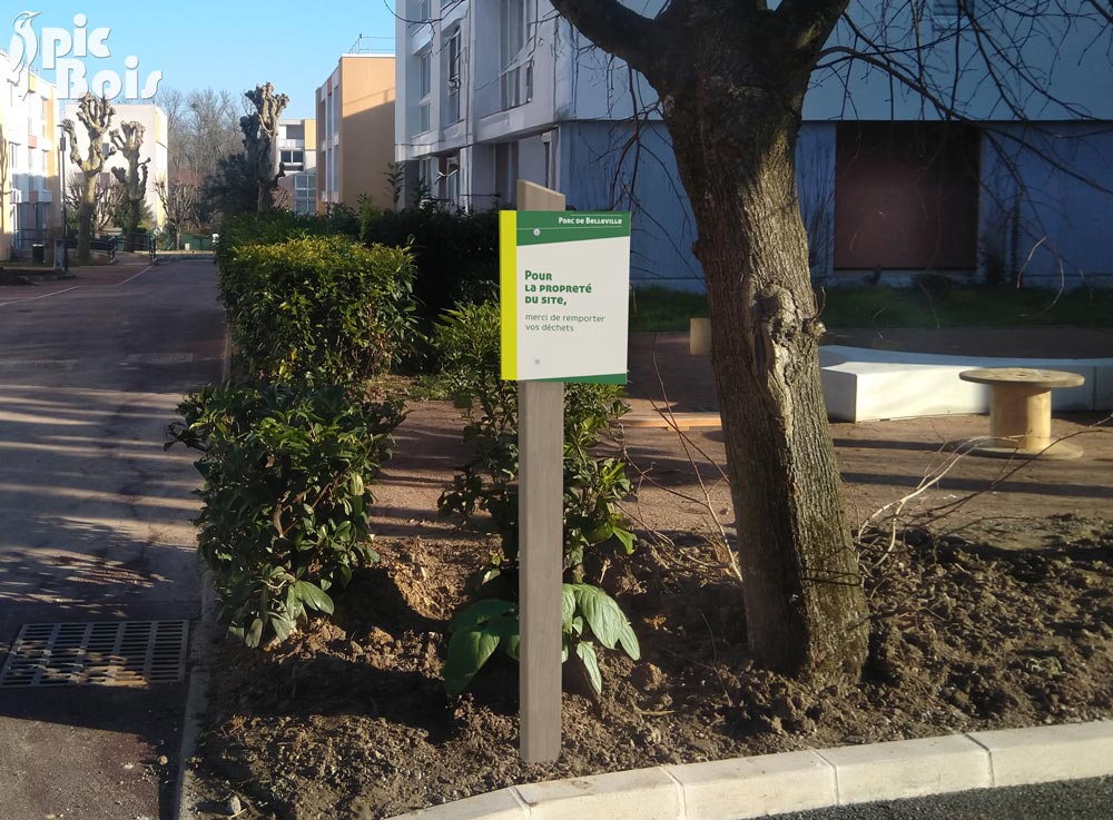 Plaque thématique sur structure en bois de pin, panneau en vinyle contrecollé sur dibond, pour l'aménagement d'une aire de repos. Le panneau invite les usagers à récupérer leurs déchets une fois leur pause terminée.