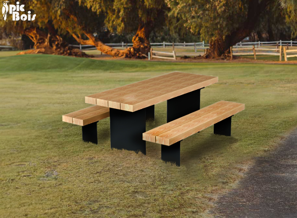 Table de pique-nique avec pieds en métal, assise et plateau en bois de la gamme Symbiose, pour l'aménagement d'un parc.