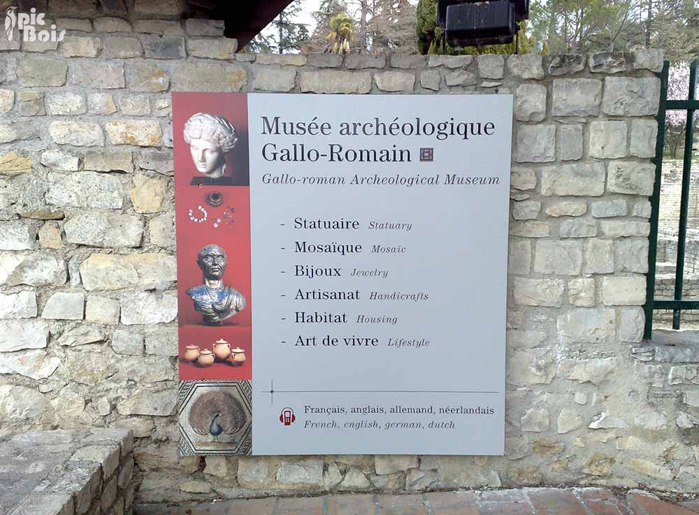 Signalétique touristique pour le Musée archéologique Gallo-Romain. Ce panneau d'accueil, installé sur un mur en pierre, informe sur les diverses sections du musée. L'utilisation d'images et de textes en deux langues (français et anglais) facilite la compréhension pour les visiteurs internationaux. Les illustrations ajoutent une touche visuelle agréable et aident à capter leur attention. Réalisé en matériau durable, adapté aux conditions extérieures, ce panneau s'intègre harmonieusement dans l'architecture historique du site, tout en assurant une durabilité et une visibilité optimales.