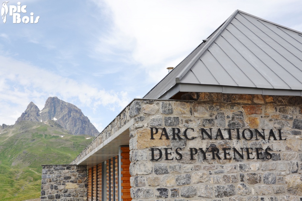 Enseigne murale en lettres découpées pour le bâtiment d'accueil du Parc National des Pyrénées.