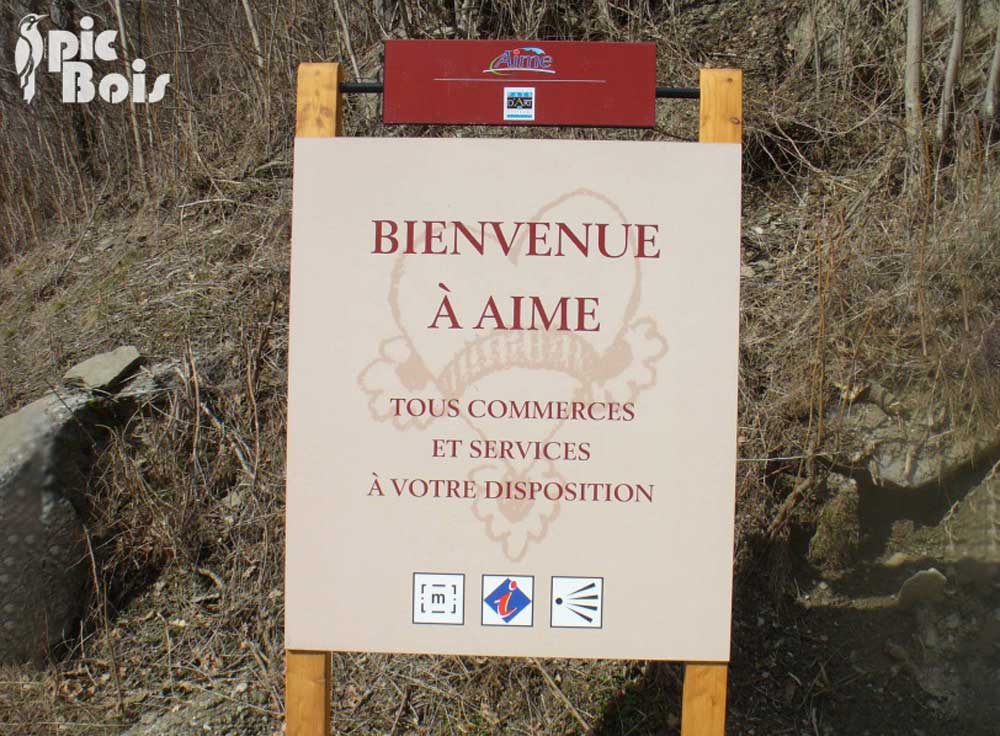Panneau d'information d'accueil de commune avec structure en bois et panneau inclusion, bandeau titre fixé sur barre en métal.