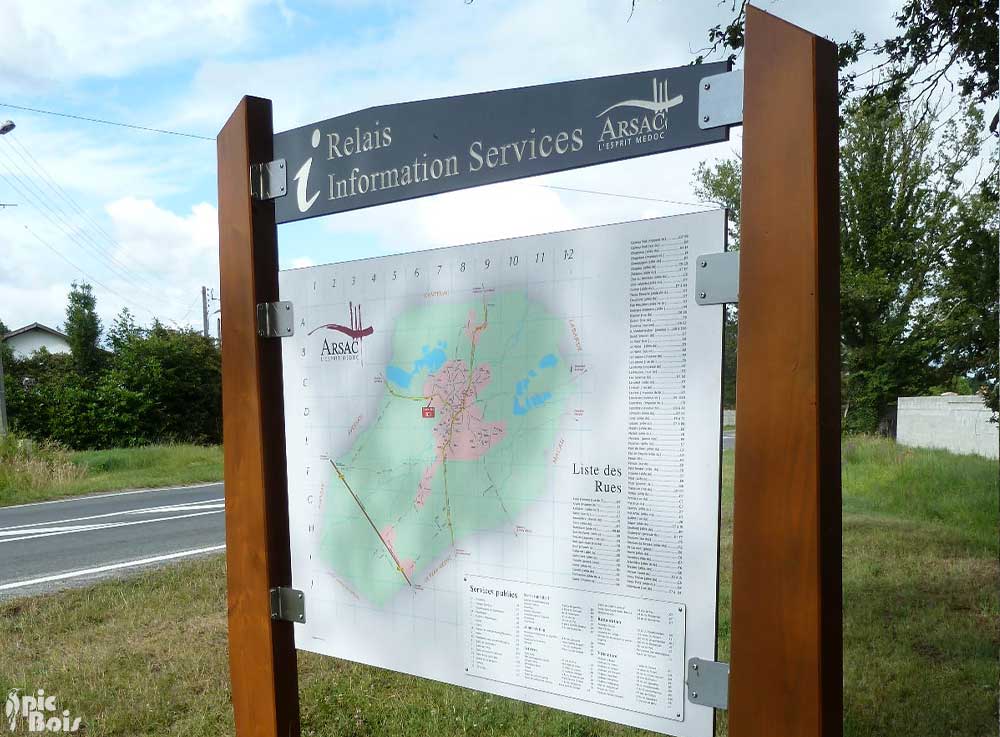 Panneau d'information relais informations services avec structure en bois, bandeau titre en compact gravé et peint et panneau avec plan et liste des commerces et services de la commune.