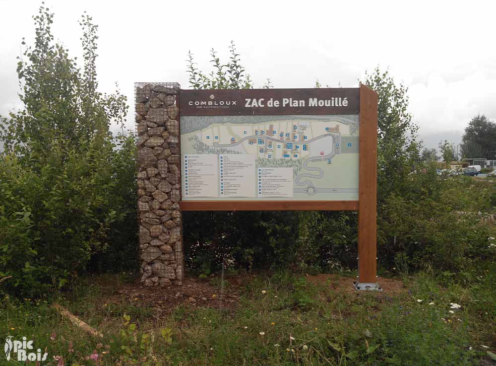Panneau d'information avec plan d'une ZAC. Structure en gabion et en bois, panneau en vinyle imprimé et contrecollé sur dibond, bandeau titre en compact rouille gravé et peint.