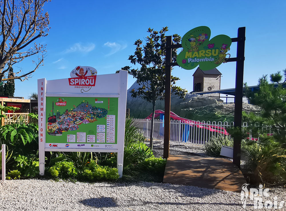 Panneau d'informations et arche attraction pour le Parc d'attractions Spirou