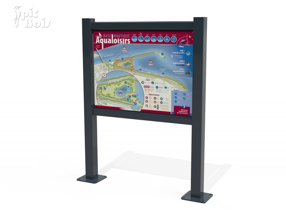 Panneau d'information de base de loisirs avec plan et consignes du site, structure en acier thermolaqué.