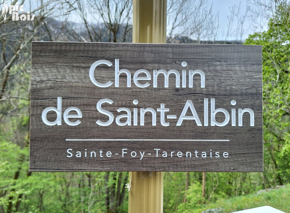 Plaque de rue en imitation vieux bois, avec lettres gravées, pour la commune de Sainte-Foy Tarentaise.
