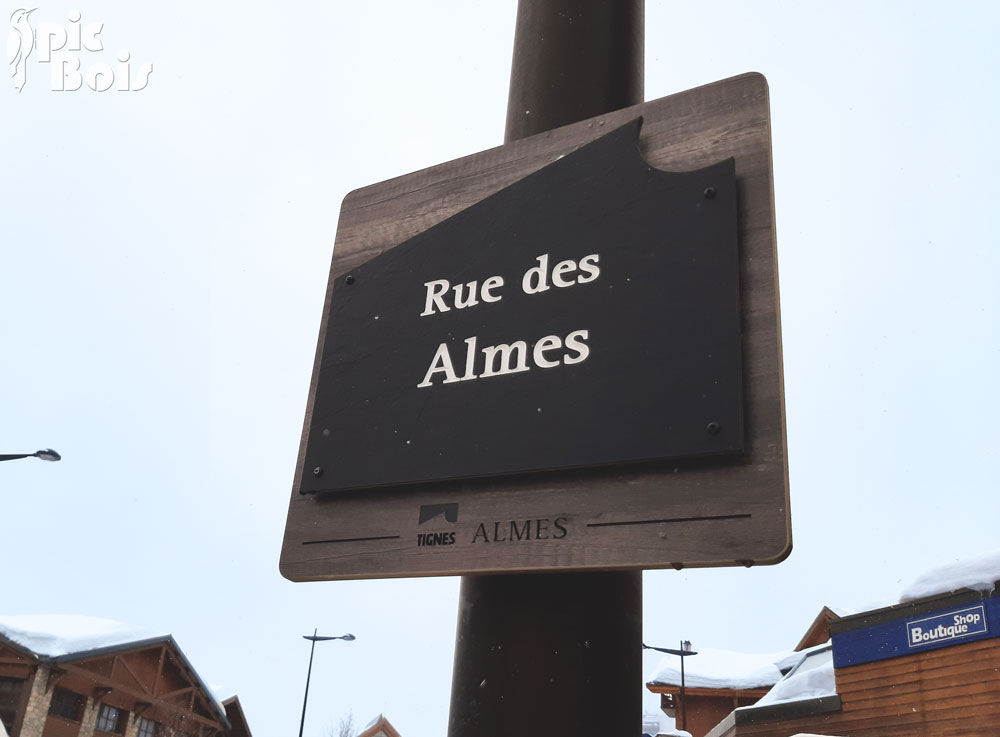 Plaque de rue, fond en compact imitation bois, plaque rapportée gravée et peinte avec le nom de la rue. Fixation sur poteau.