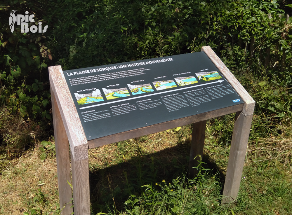Panneau imprimé sur Reynobond pour présenter l’évolution naturelle et paysagère des Olivettes. Les visiteurs peuvent lire et observer les transformations du site au fil du temps, facilitant la compréhension de la dynamique écologique de l’ENS.