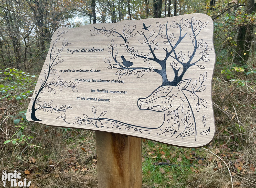 Table de lecture en bois avec une gravure en forme de cerf, sur le jeu du silence, pour l'aménagement du sentier de découverte de la commune de Rosnay.