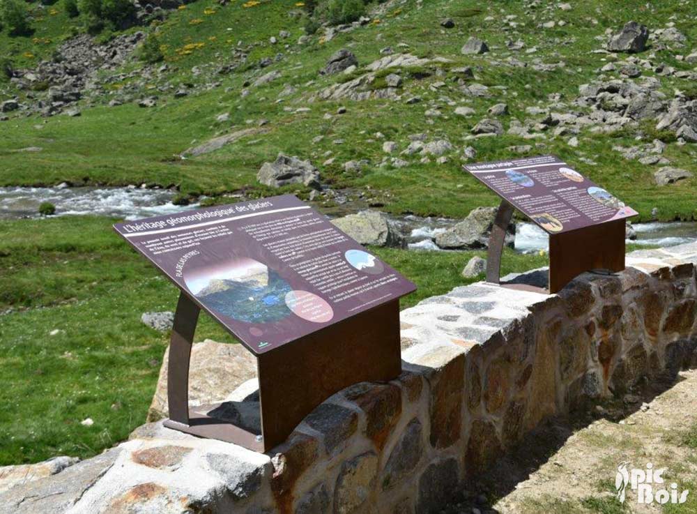 Tables de lecture en métal sur muret, panneaux en impression - Pla de Las Peyres (09)