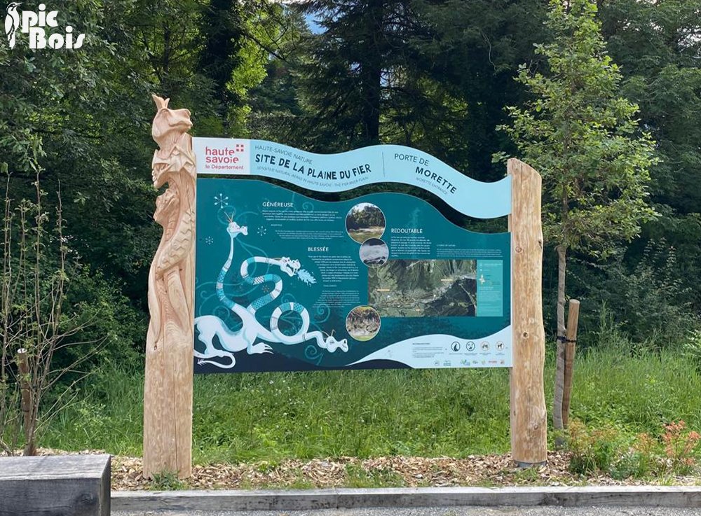 Panneau d'information avec une sculpture en bois représentant un dragon pour l'aménagement du site de la Plaine du Fier.