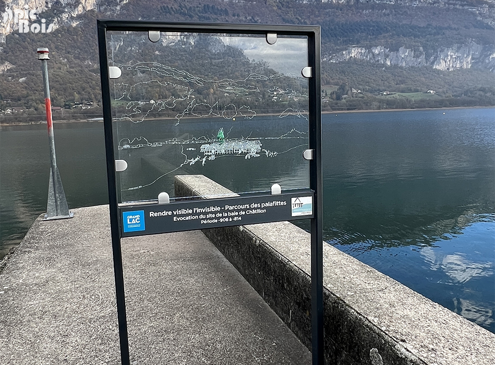 Panneau avec structure en acier et vitre gravée pour l'interprétation du paysage.