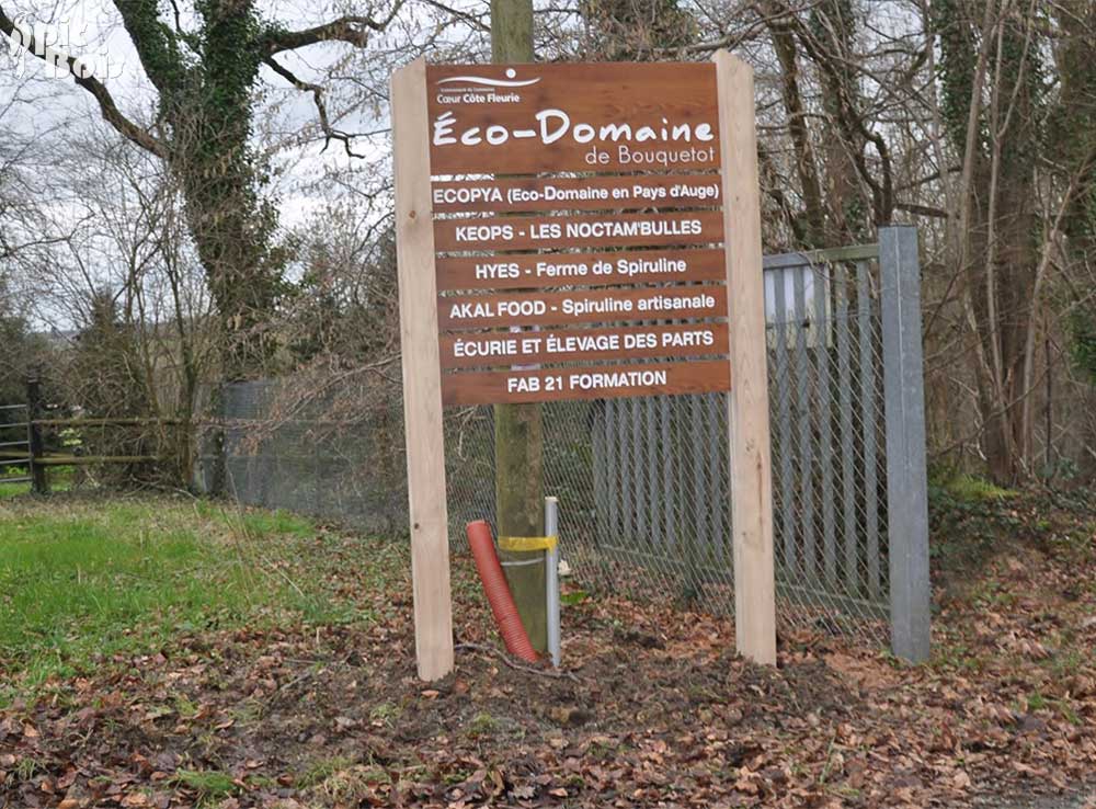Signalétique d'information locale pour l'Eco-Domaine de Bouquetot, structure en bois et lames en compact gravé et peint.