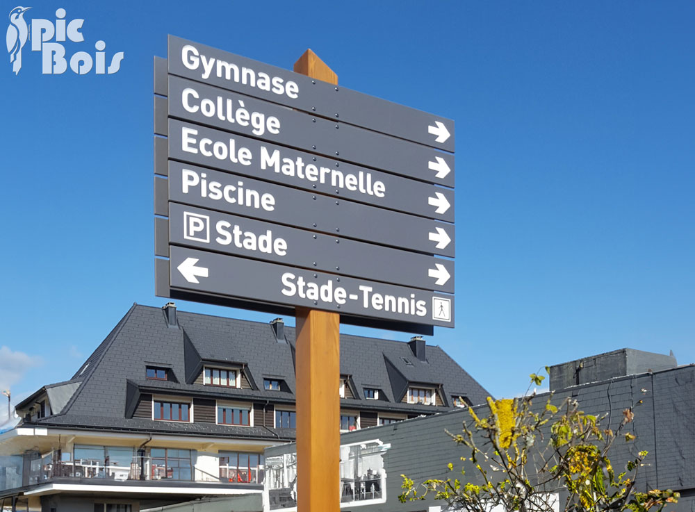 Signalétique d'information locale avec flèches en compact gravé et peint, fixées sur mât en bois.