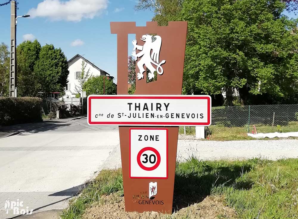 Panneau d'entrée de commune ; structure en métal avec découpes traversantes, silhouette en compact - Thairy (74)