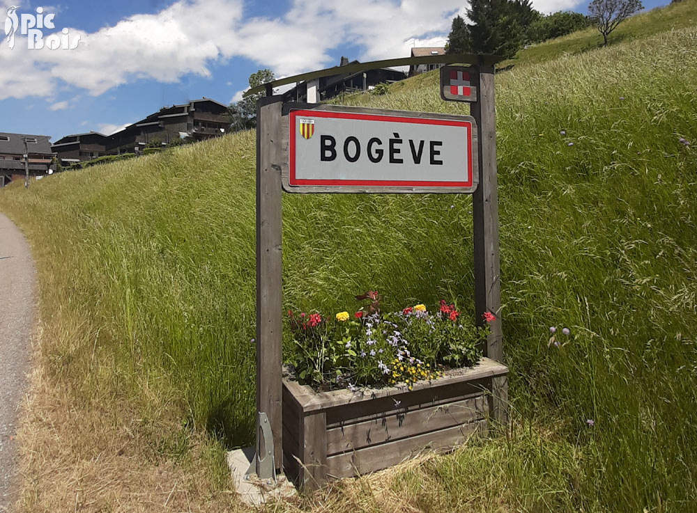 Signalétique d'entrée d'agglomération avec structure en bois et toit cintré. Blason de la Savoie rapporté sur drapeau.