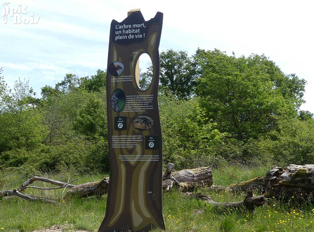 Mobilier interactif en forme d'arbre avec volets à soulever pour un sentier d'interprétation.