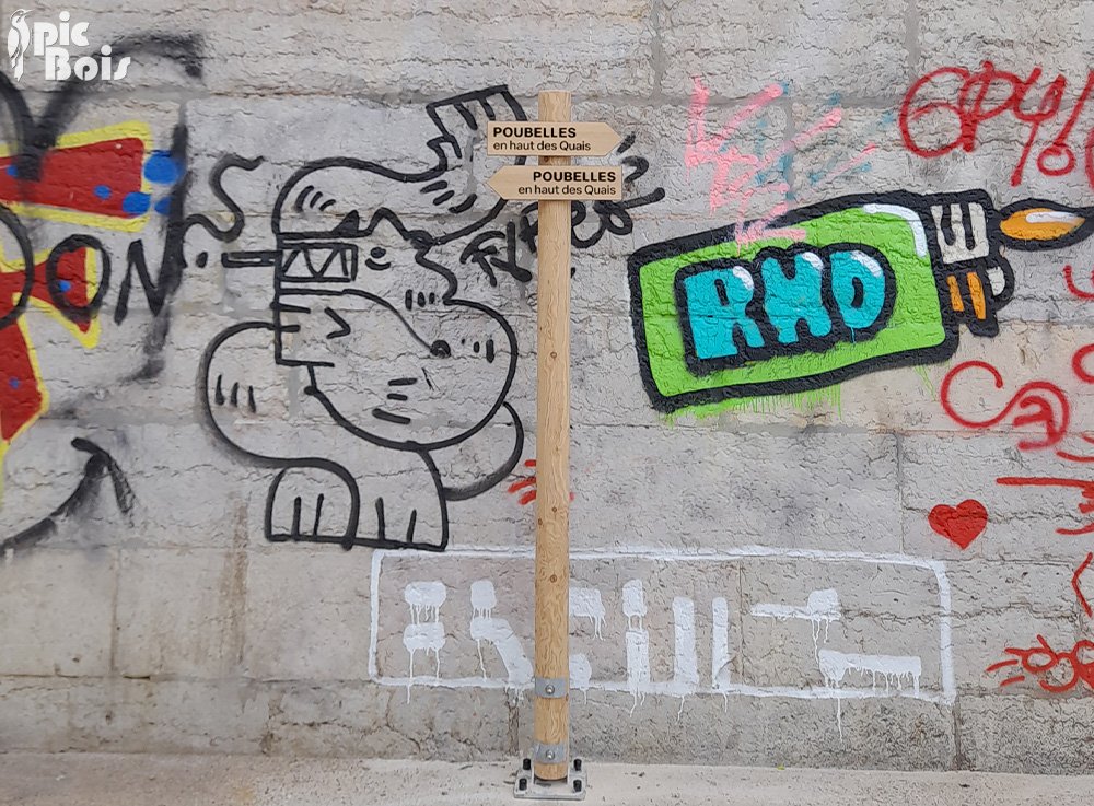 Signalétique directionnelle pour piéton en zone urbaine, mât en bois et flèches en compact gravé et peint, pour un aménagement temporaire sur les quais de Saône.