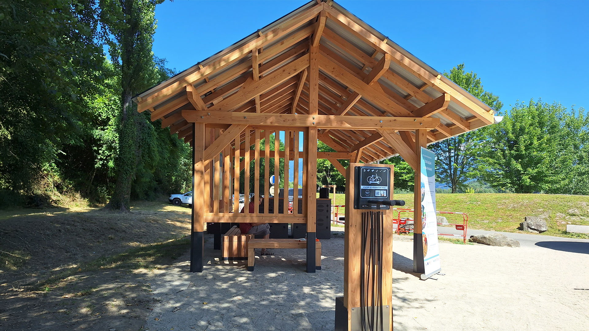 La première aire inaugurée se situe à Saint-Pierre-d’Albigny (73), sur le site du lac de Carouge, en lien avec les campings et les sites touristiques du secteur. Conçue comme une véritable pause pour les cyclistes, elle offre :