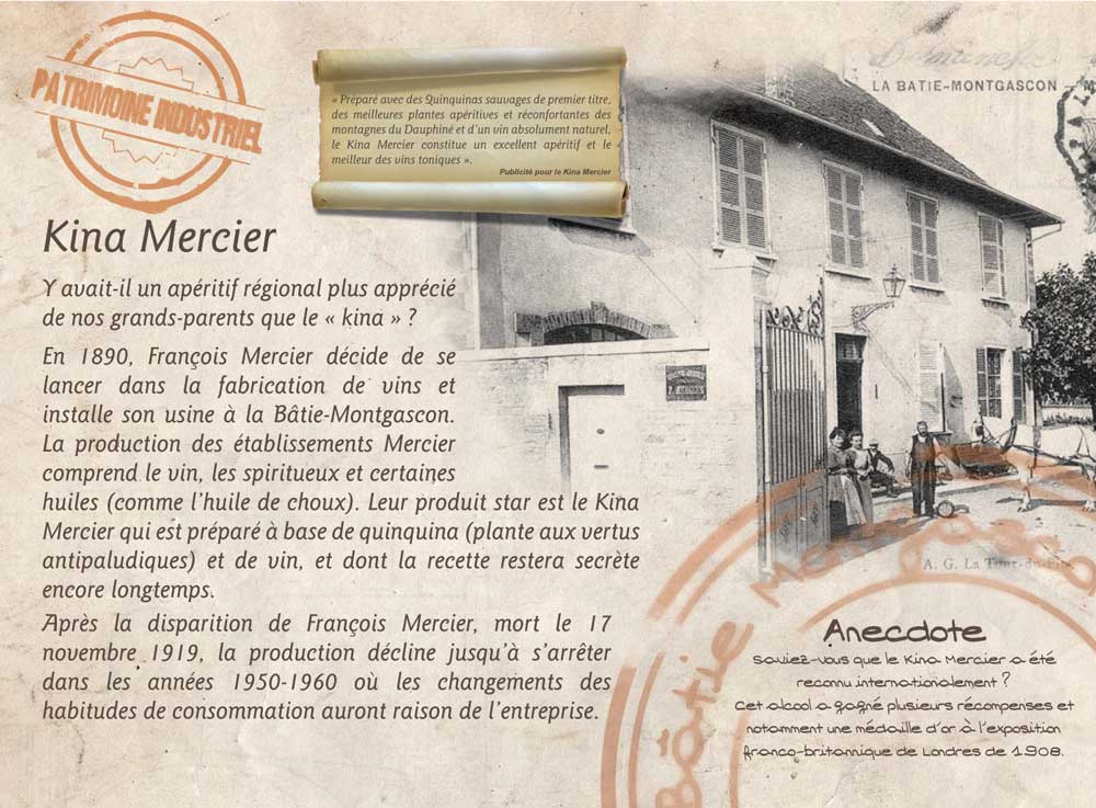 Les plaques murales, à La Bâtie Montgascon, donnent discrètement des informations sur les édifices comme sur les grandes figures de la ville. L’intégration d’une estampille d’époque à la mise en page fait voyager dans le temps.