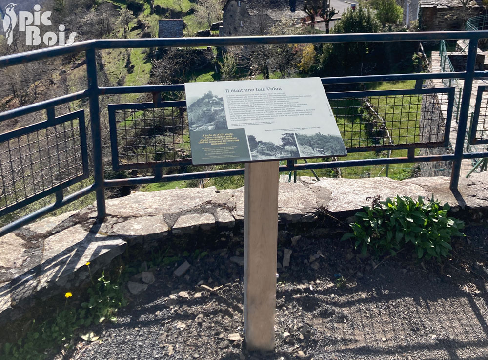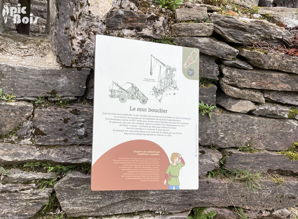 Des plaques thématiques fixées sur mur ou sur poteau en châtaignier mettent en valeur les points d’intérêt des lieux.