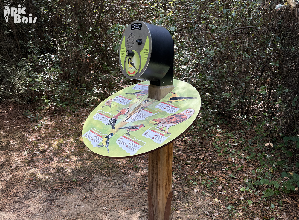 - et un pupitre sonore à manivelle, diffusant les chants de 8 espèces d’oiseaux présents sur le site.