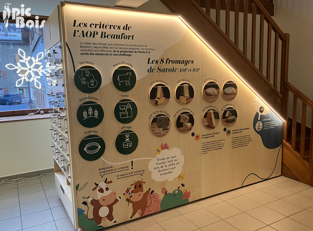 Les panneaux ont permis l’habillage de plusieurs murs, dont une fresque de plus de 5 mètres. Des silhouettes de vaches viennent enrichir le parcours et apporter une dimension à la fois pédagogique et ludique.