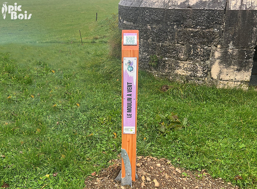 Les mobiliers ont été conçus et installés en respectant la sensibilité et la fragilité des lieux. La structure des mobiliers est en bois ou en acier thermolaqué, et les panneaux en inclusion par vitrification.
