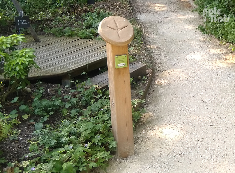 - Bornes empreintes de 1 mètre de hauteur, surmontées d’empreintes d’animaux en résine, avec des volets à soulever contenant des questions et réponses sur la faune locale.