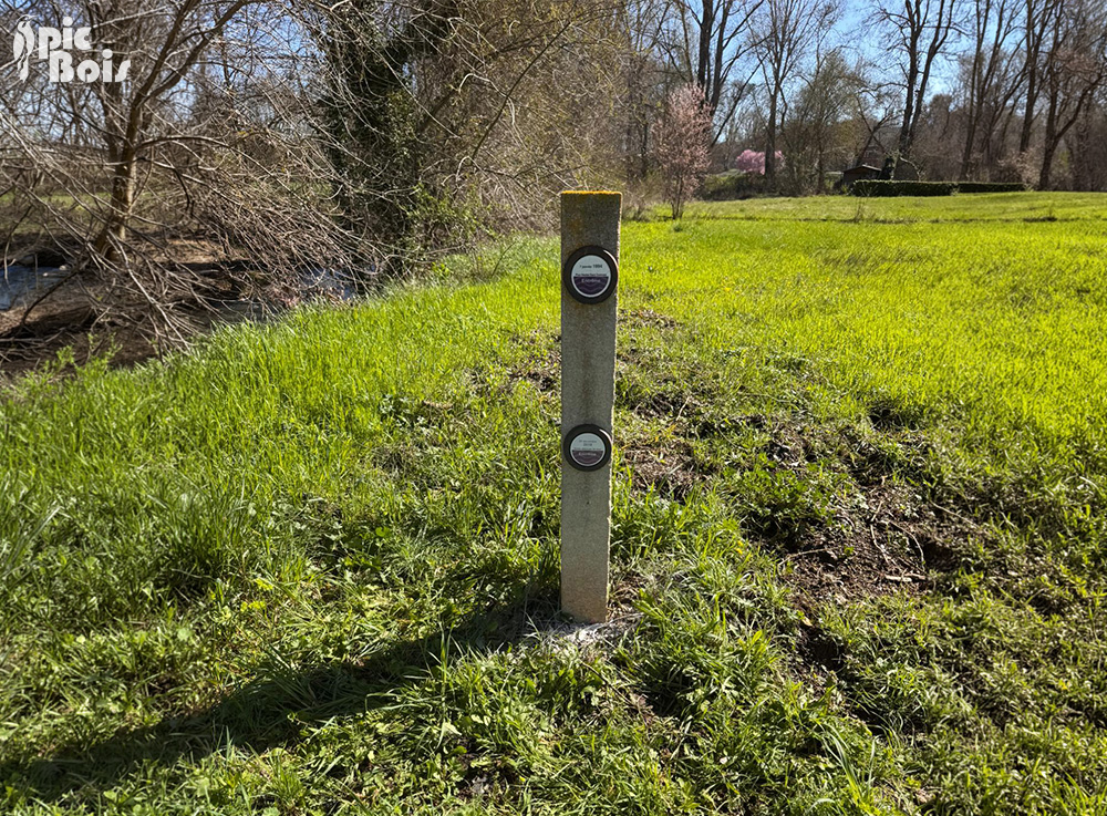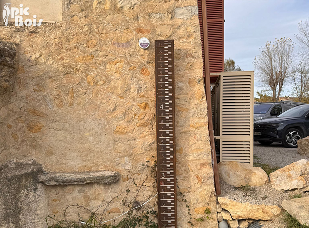 Plus visible et pédagogique, le totem de crue peut combiner échelle, repère et informations complémentaires sur les crues.